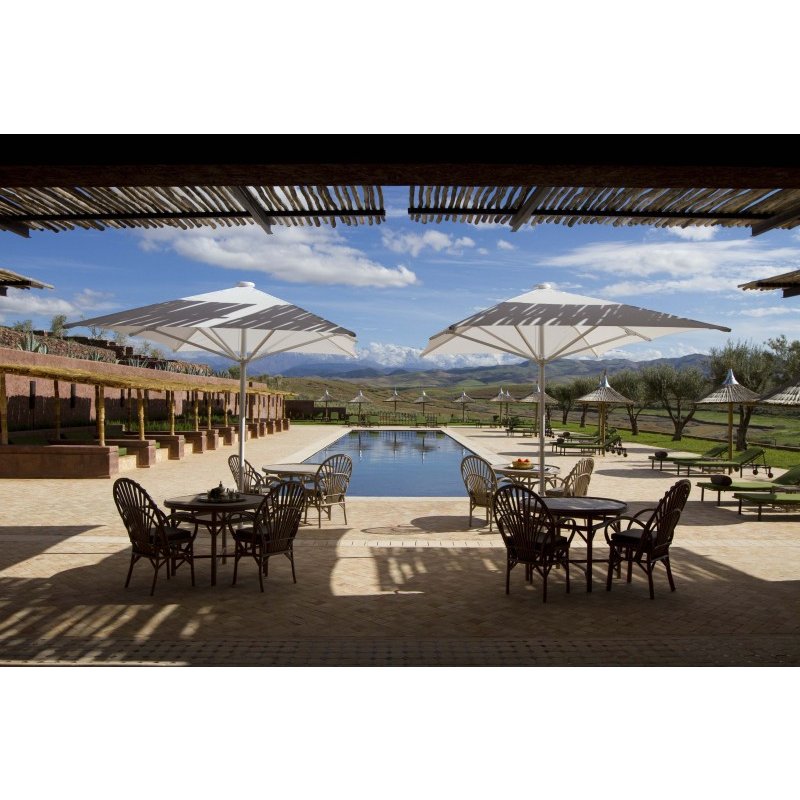La piscine du Palais Paysan miroir d’eau au dessin minimal, face à la démesure du paysage a elle aussi une dimension exceptionnelle de 30 m de long. La mosaïque de verre translucide d’un gris intense réfléchit la lumière avant de la renvoyer vers le fond. 30 mètre de détente et de pur bonheur. Une petite plage de 30 cm de profondeur vous permet de vous délasser tout en vous rafraichissant. Les immenses terrasses qui entourent la piscine vous invitent à profiter d’un ensoleillement maximum à toute heure de la journée, face à l’atlas elles dominent le paysage et procurent un vrai moment de détente. D’un côté vous disposez de lit de repos à l’abri du soleil et de l’autre de nombreux transat et parasols vous attendent. Il est possible d’y déjeuner le midi avec des salades ou grillades et aussi d’y déguster jus de fruits fraîchement pressés, thé, café ou cocktails ou encore de choisir un dessert « maison ».